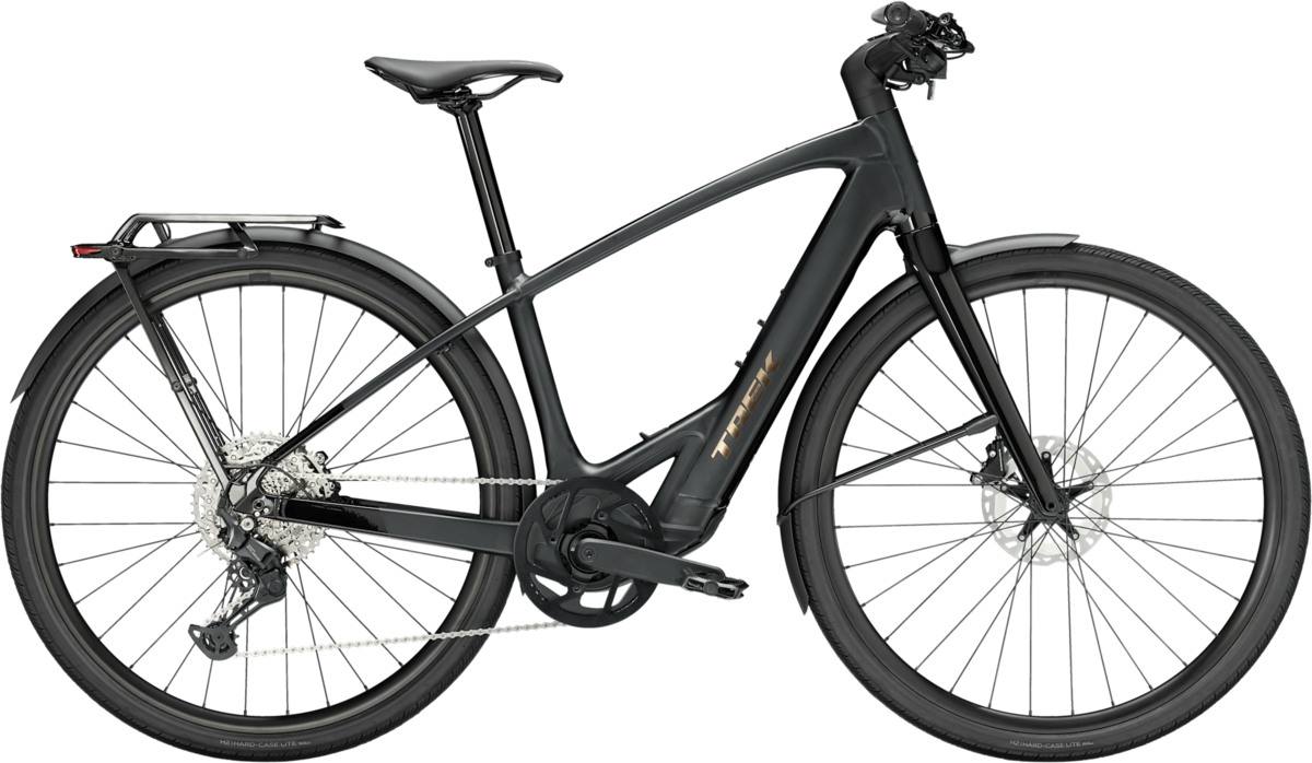A sleek Alpha Platinum Aluminum frame with a carbon fork. TQ's quiet and compact HPR50 motor (50nm/250W) capable of speeds up to 28mph, with a 360Wh battery and built-in LED display. Clean shifts from a 10-speed Shimano CUES U6000 drivetrain, powerful hydraulic disc brakes, and 700c wheels with grippy 40mm tires. Plus, all the odds and ends you need for the commute, like built-in front and rear lights, a kickstand and a MIK-compatible rear rack.